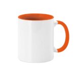 Taza de cerámica AA de 350ml. Diseño exterior en color blanco especialmente diseñado para la sublimación, pudiendo transferir todo tipo de diseños a todo color, y con una original asa e interior de colores vivos. Cada taza viene presentada en caja individual kraft.